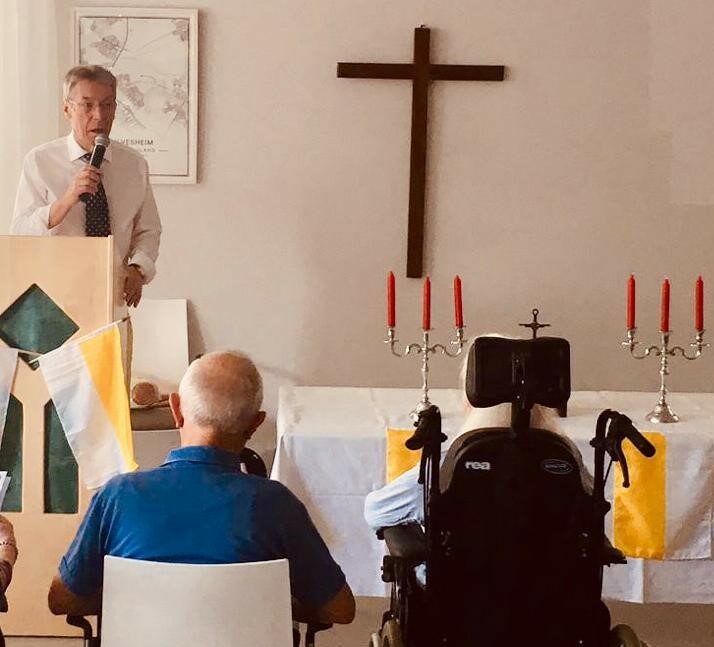 Zu Fronleichnam konnten wir für die Bewohner des Regine-Kaufmann-Hauses wieder eine Fronleichnamsfeier anbieten. Dabei war auch die CD-Aufnahme des Kirchenchors St. Peter Ilvesheim zu hören. Dem großen Engagement von Hartwig Trinkaus ist es zu verdanken, dass diese Feier wieder möglich war. 09..06.2023